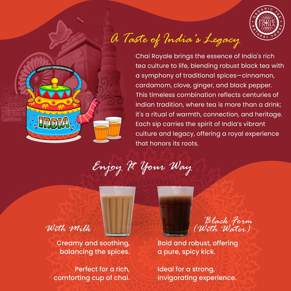 Our Chai Royale - Exquisite Spiced Tea combines the strength of the Assam Black Tea with the aroma of the most exotic Indian Spices like Black Pepper, Cinnamon, Cardamom, Clove, & Ginger. Its bold black tea flavor and a spicy zest gives it an invigorating fragrance with a refreshing sweetish-spicy touch. An expertly perfected cup of tea.