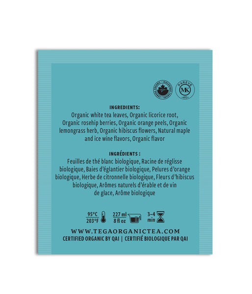 White tea, Licorice root, Rosehip berries, Orange peels, Lemongrass, Hibiscus flowers, Natural Maple flavor, Natural Ice-Wine flavor, Organic Flavor